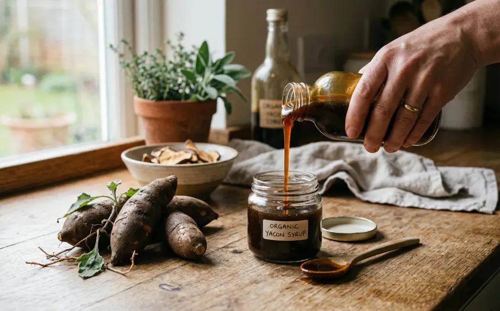 Yacon syrup comes from a root plant and contains prebiotic fibers.