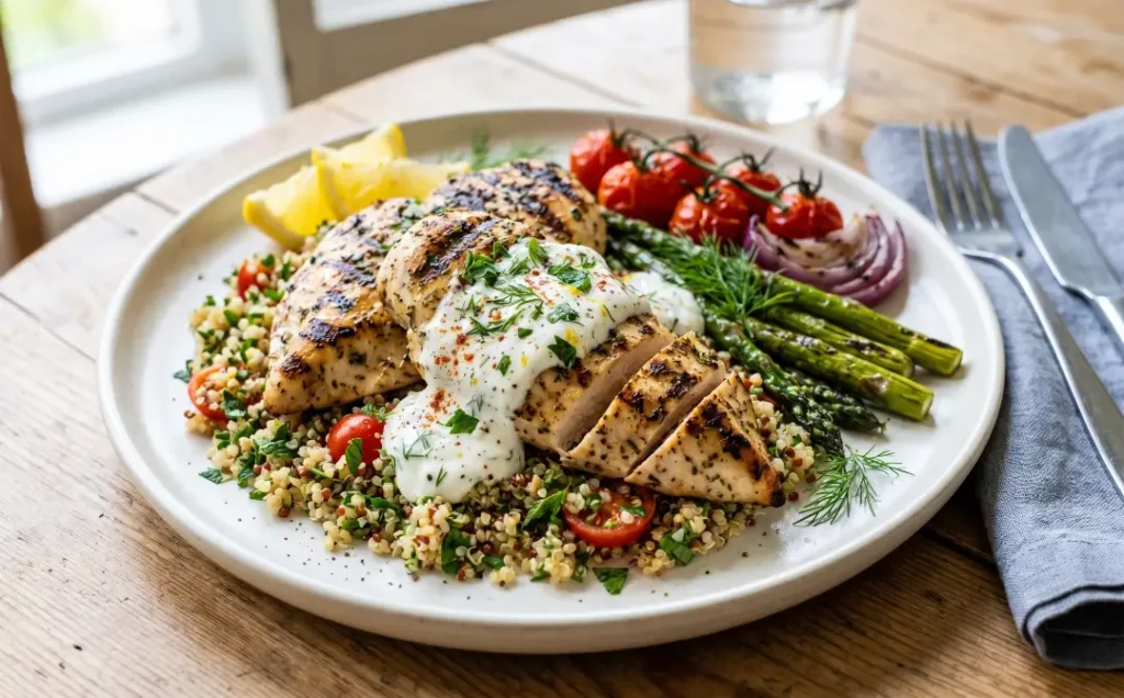 1. Grilled Chicken Breast with Quinoa and Greek Yogurt Sauce
