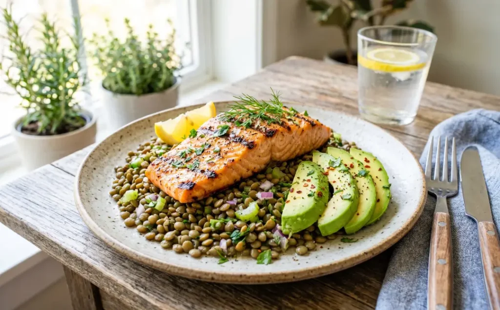 3. Salmon with Lentils and Avocado