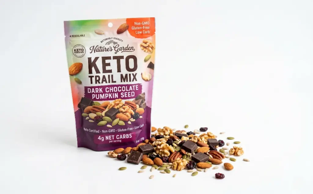 Nature’s Garden makes a specifically labeled keto trail mix that is available at many Walmart locations in the snack or health food aisle. The keto variety typically includes almonds, walnuts, macadamia nuts, pumpkin seeds, sunflower seeds, and a small amount of dark chocolate chips or unsweetened coconut. A one-ounce serving generally contains around 12 to 14 grams of fat, 3 to 4 grams of protein, and between 3 and 5 grams of net carbs. Trail mix is one of the more satisfying keto snacks because of the variety of textures and flavors in a single handful. The mix of nuts and seeds provides a broad spectrum of micronutrients including zinc, selenium, and omega-3 fatty acids from the walnuts. One thing to watch with trail mix is portion size, since the small pieces make it easy to eat more than you realize. Pre-portioning into small bags or containers when you get home from Walmart makes on-the-go snacking much more controlled and sustainable. This particular mix is designed with keto in mind, so the ingredient selection and proportions are much more favorable than standard trail mix.