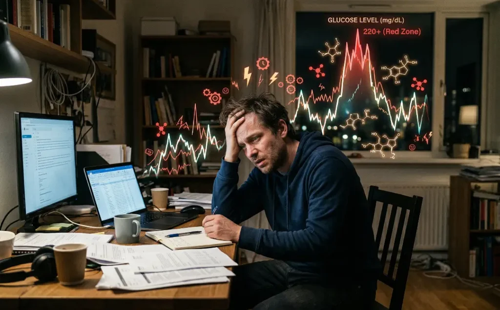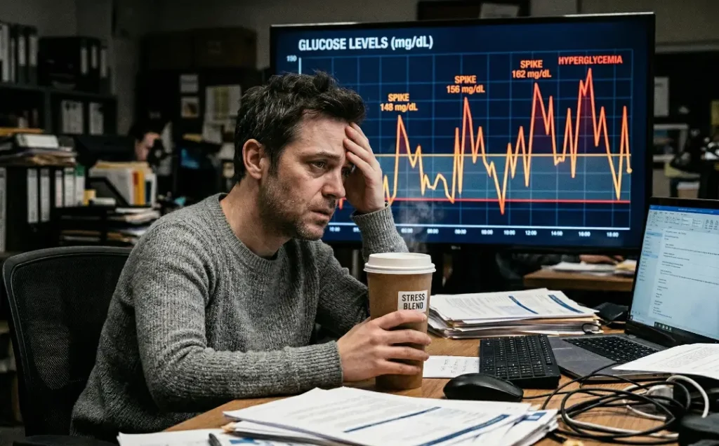 Work-related stress can be chronic, especially in high-demand environments. Constantly feeling under pressure leads to higher levels of cortisol, which in turn increases blood glucose. This can result in heightened glucose fluctuations and, if prolonged, can lead to the development of insulin resistance.